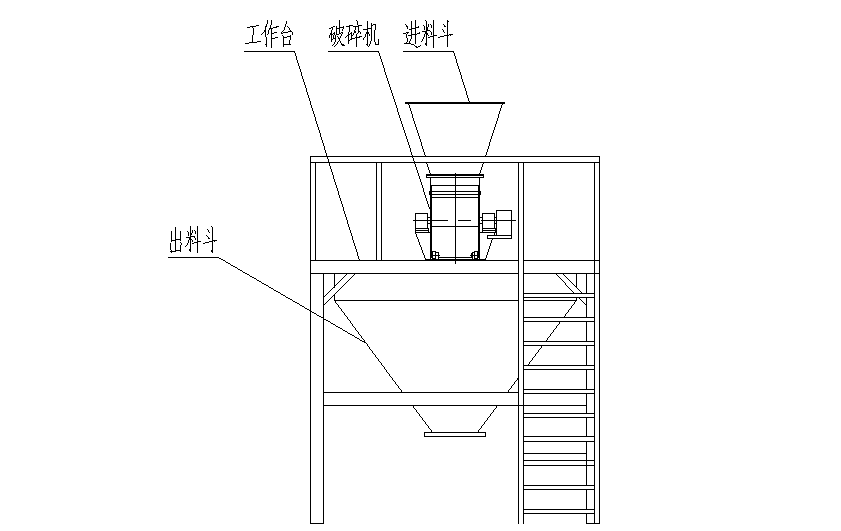 2.3 整机包含进出料斗、主机、机架、传动部件等,工作时电机经一对皮带轮等速驱动主轴高速旋转,主轴上装有若干把锤片。物料从升运机自由落入进料斗,被高速旋转的锤片切碎,由于离心力的作用,破碎后的物料颗粒由腰形的筛孔落入出料斗,然后由另配的螺杆泵泵入下道工序。