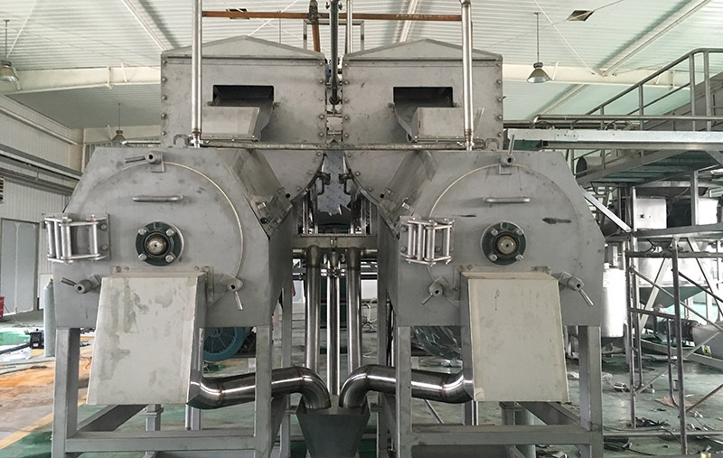 6. 去核制浆:经过破碎机初破碎的红枣通过螺杆泵进入去核制浆机的打浆室内,通过打浆叶片的高速旋转作用下使物料获得离心力而抛向筛网,物料在打浆叶片与筛网 进行产生相对运动的过程中因受到离心力以及揉搓作用而被进一步打击成浆,物料经筛网孔进入收集器,再由螺杆泵输送至下一工序,而渣皮、果核等则由出渣斗排出。
